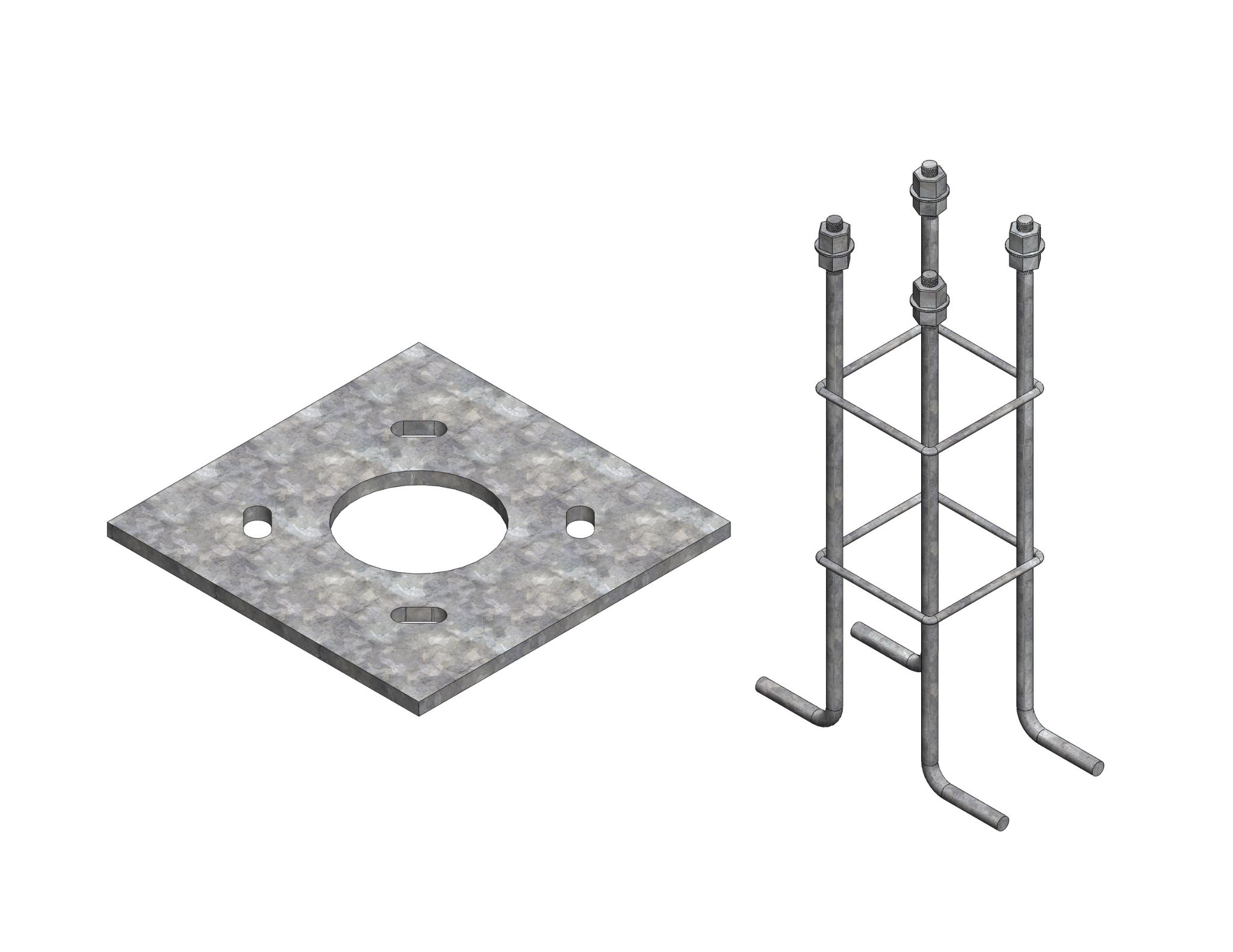 Kit de fundación compuesto por canastillo de 7/8″x700 mm y placa 340x340x12 mm para instalación de postes.